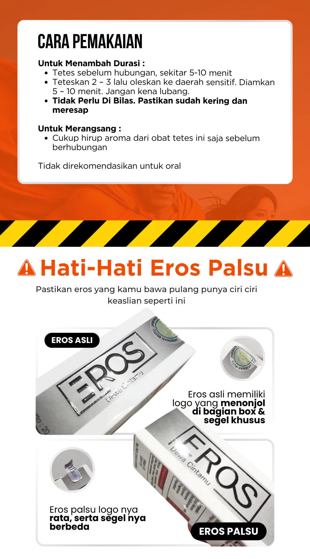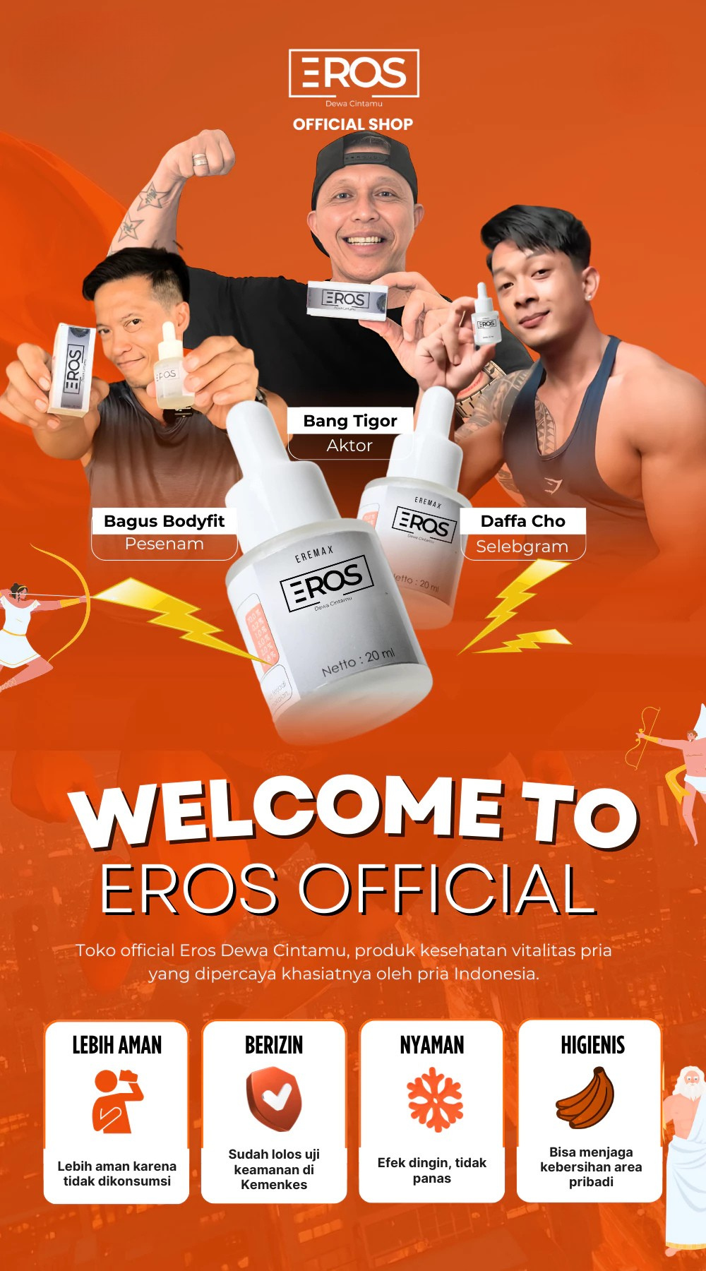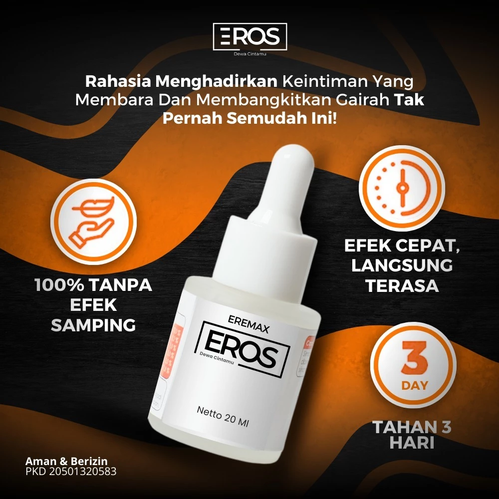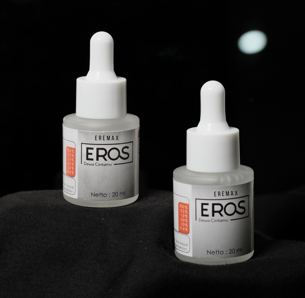 Eros adalah produk dengan formula yang dibuat dengan teknologi dan penelitian yang pastinya aman. Eros merupakan serum kejantanan bagi pria. Yang memiliki khasiat sebagai obat tetes penambah durasi, memikat wanita dengan wanginya dan untuk daya tahan lebih lama dalam melakukan hubungan bercinta, membersihkan dan menyegarkan kulit dengan efektif